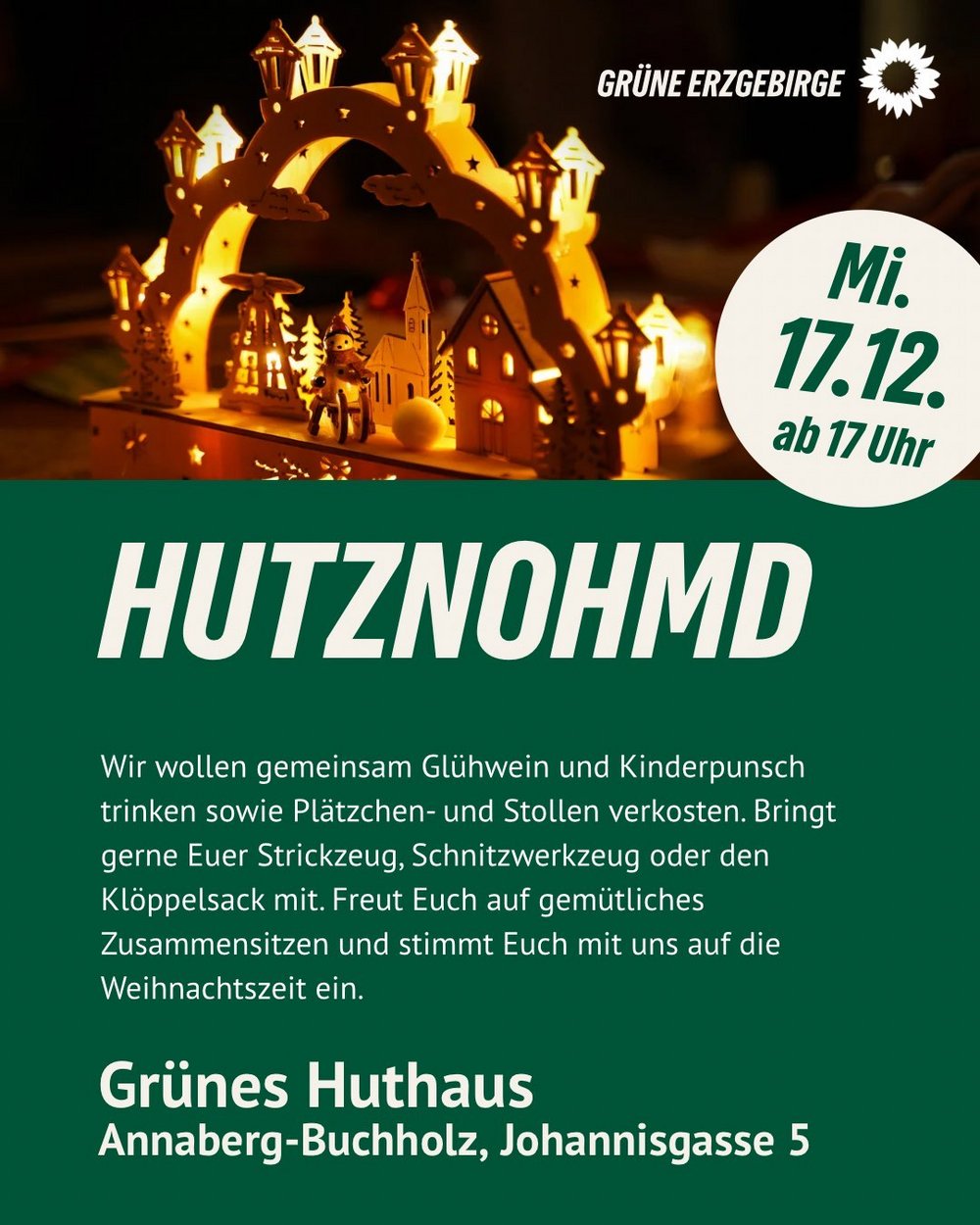 🎄 Hutznohmd bei den GRÜNEN Erzgebirge 🎄 Am Mittwoch, den 17. Dezember ab 17 Uhr, laden wir herzlich zum gemütlichen Beisammensein ins Grüne Huthaus in Annaberg-Buchholz (Johannisgasse 5) ein. Bei Glühwein, Kinderpunsch, Plätzchen und Stollen wollen wir gemeinsam die Vorfreude auf Weihnachten genießen.