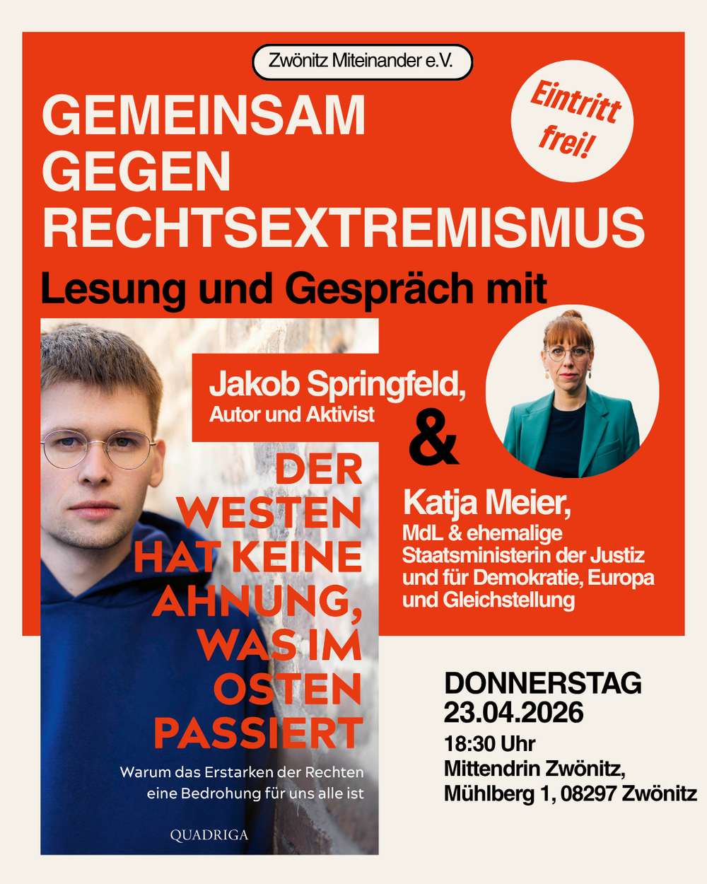Am 23. April 2026 lädt Zwönitz Miteinander e.V. zu einer offenen Gesprächsrunde mit Jakob Springfeld und Katja Meier ins Mittendrin Zwönitz ein. Ausgehend aus Springfelds Buch „Der Westen hat keine Ahnung, was im Osten passiert“ sprechen beide darüber, wie gesellschaftliche Spannungen entstehen, warum rechtsextreme Strukturen vielerorts an Einfluss gewinnen und welche Handlungsmöglichkeiten Kommunen, Vereine und Bürgerinnen und Bürger haben.