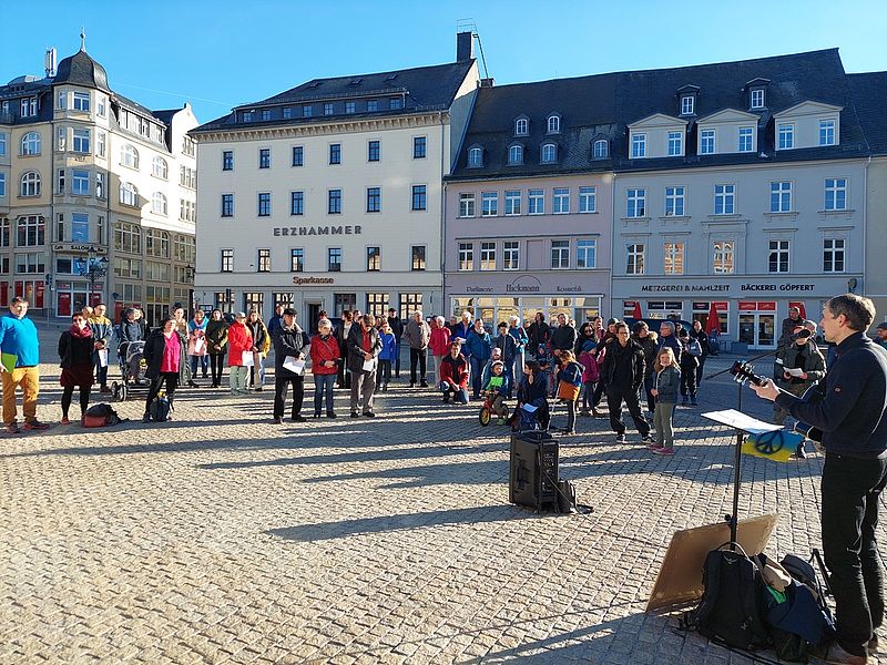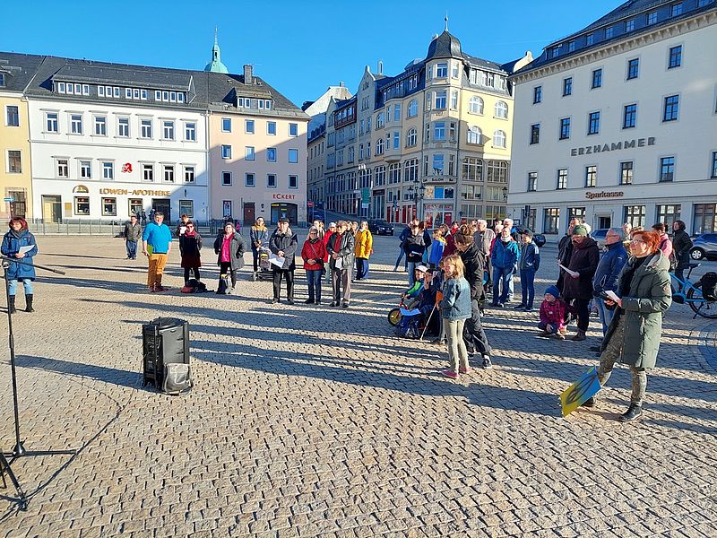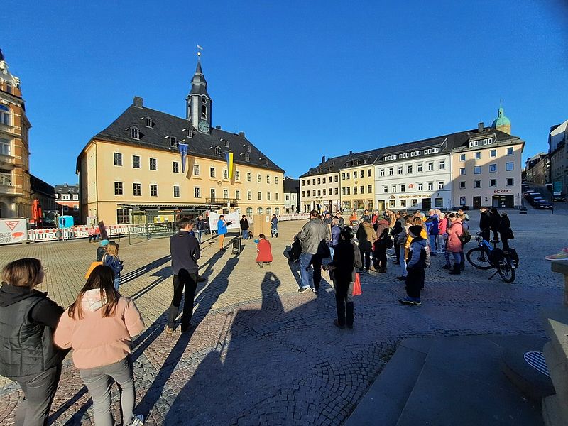 An die 60 Menschen versammelten sich am Montagabend auf dem Annaberger Markt, um gemeinsam für Frieden zu demonstrieren. Hilflosigkeit und Fassungslosigkeit angesichts des 47. Kriegstages in der Ukraine waren ebenso Themen wie auch Forderungen an Putin, sich sofort aus der Ukraine zurückzuziehen und den Krieg zu beenden. Zu der Veranstaltung aufgerufen hatte Rosi Schmidt-Löschner, Kreissprecherin der Bündnis 90/DIE GRÜNEN. Gemeinsam mit Mitgliedern der katholischen und evangelischen Kirche, des Theaters, des Annaberger Stadtrats und der Landessprecherin der Grünen, Christin Furtenbacher, gab es ein Programm mit Redebeiträgen und Musik. Der Dank ging dabei auch an die vielen Erzgebirger*innen, die sich hier vor Ort in Unterstützer*innenkreisen, durch Bereitstellung von Wohnraum, als Ansprechpartner*innen oder in Form von Spenden einbringen. Die Demonstration verlief dann durch die Stadt zum alten Friedhof. Der unschätzbare Wert der Meinungsfreiheit, Demokratie und des Friedens, in dem wir hier leben, wurde in mehreren Redebeiträgen angesprochen.